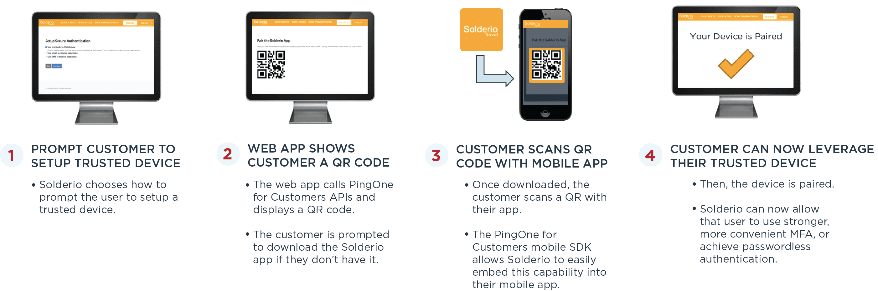 Along with MFA options of SMS and email, PingOne for Customers Mobile SDK (Beta) now allows strong authentication in the form of push notifications to be embedded right into an enterprise’s own custom mobile application. Rather than depending upon your end users to download a third-party authentication app—a process so inconvenient that many consumers won’t bother, resulting in a dependency on SMS and email as MFA factors—you can make authentication both easier and more secure via push notifications to a trusted device. Adding a trusted device can be done in a few easy steps so customers can quickly start utilizing this capability.