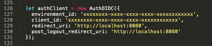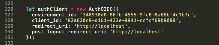 Open the index.html file in the code editor of your choice and scroll to the bottom, where you’ll find the entries for client_id, environment_id and the redirect URIs.
