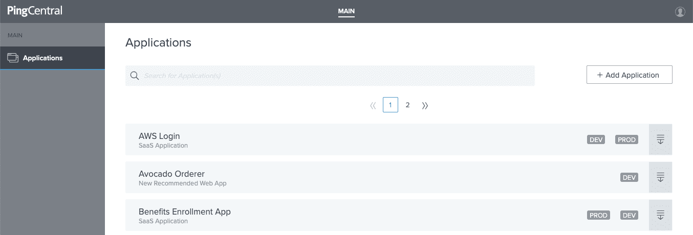 1. As an application owner, when you log into PingCentral, you see only the apps you have created or that have been assigned to you. To add an application, select “Add Application.”