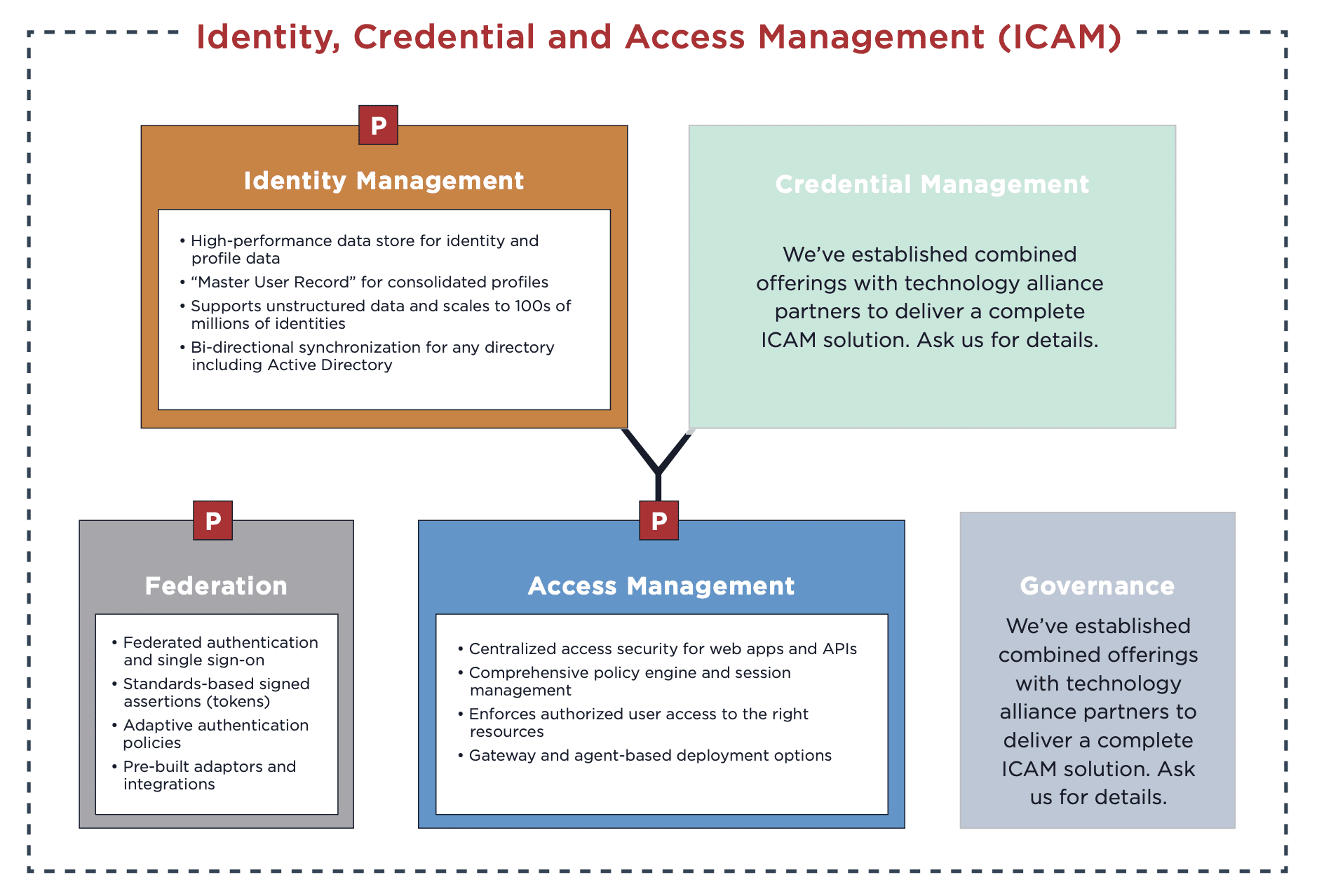 ICAM consists of five components: federation, identity management, credential access management and governance. Within each area, Ping Identity and our partners provide key capabilities that can help enhance your existing architecture without needing to rip and replace your entire infrastructure. Let’s review each ICAM area and explore how you can address them with standards-based offerings.