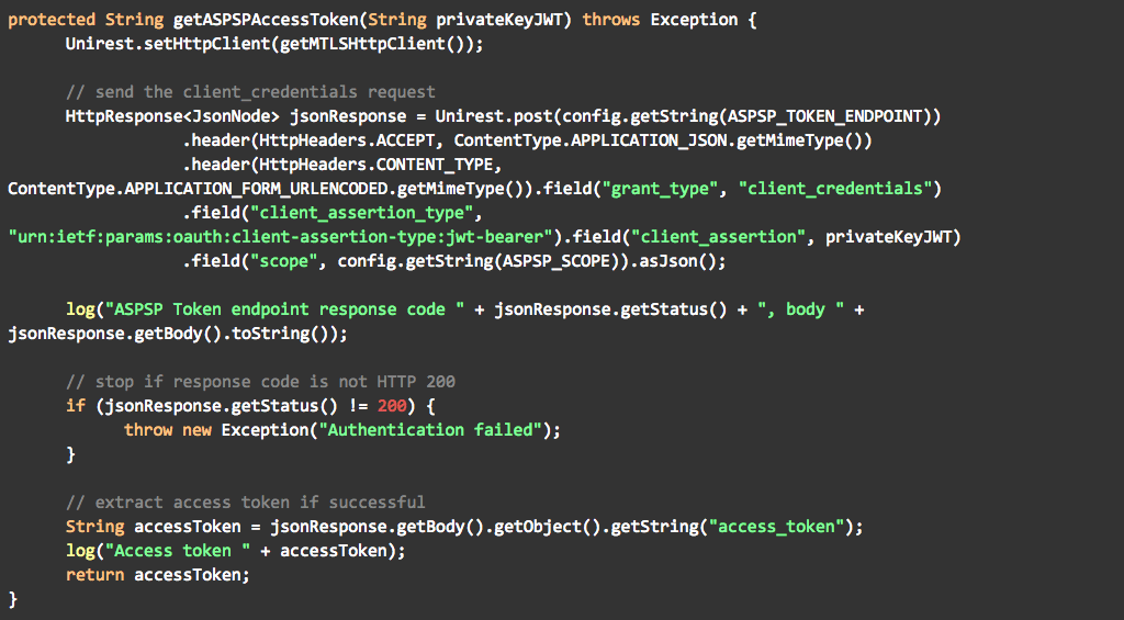 Once the private key JWT is available, the tool sends the token request to the ASPSP token endpoint. I implemented the actual call with Unirest for convenience.