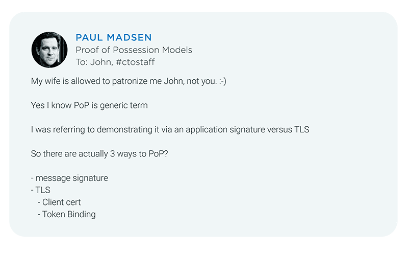 Alas, none of those criteria apply to the email thread below with John Bradley discussing Proof of Possession (PoP) models for protecting OAuth exchanges.